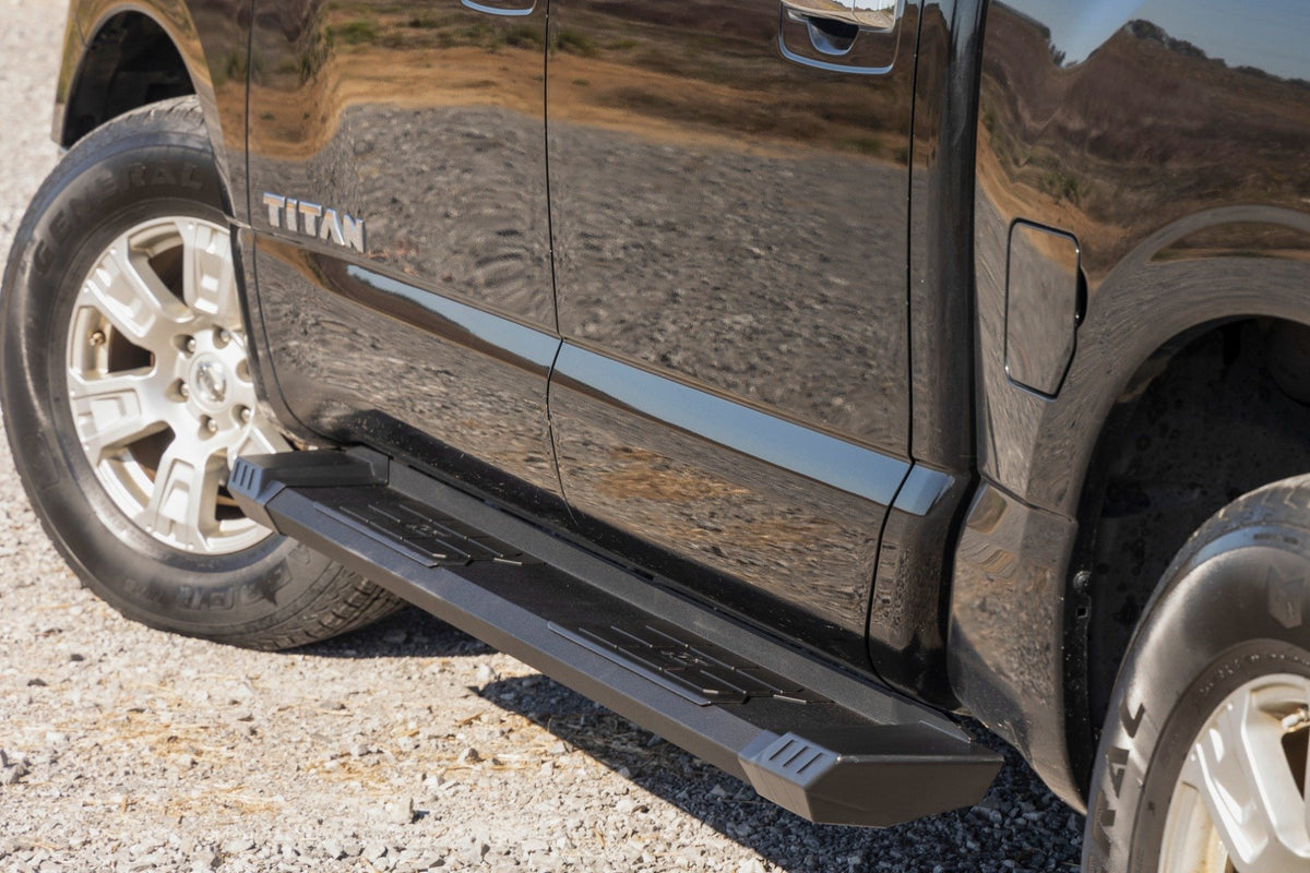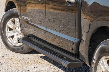 Level up your truck's functionality and style with the Rough Country HD2 Running Boards. Crafted with precision and designed for those who demand the best, our HD2 running board is engineered to be your step for a lifetime of adventures.\ Corrosion-Resistant Aluminum: Imagine stepping into your truck on a platform built for battle. That's the HD2 experience. The HD2 combines the strength of 100% aluminum with a black powder coat finish, ensuring it?ÇÖs lightweight, corrosion-resistant, and rust-free.\ Rock-Solid Protection: We know the road can be tough! That's why our HD2 running board has durable composite endcaps. No more worrying about flying rocks and debris, these endcaps are made to handle the rough stuff and still look good.\ Spacious Stepping: Got big boots? No sweat! The HD2 boasts a generous 5?ǥ wide footing area. Now you can get in and out with ease, no matter how muddy or dusty your adventures get. And with a non-slip surface, you?ÇÖll stay steady on your feet, rain or shine.\ Style Meets Function: We know looks matter. That?ÇÖs why our running board isn't just durable ?Çô it?ÇÖs made with a sleek, stylish design that blends flawlessly with your truck, providing a smooth cover for any exposed frame.\ Easy Installation: No need to spend hours in the garage. Our running board is designed for easy, drill-free installation so that you can hit the road in no time. Plus, it's compatible with most truck models, making it a hassle-free upgrade.\ With hassle-free installation and design that's as rugged as it is stylish, your truck will turn heads and tackle trails like never before.