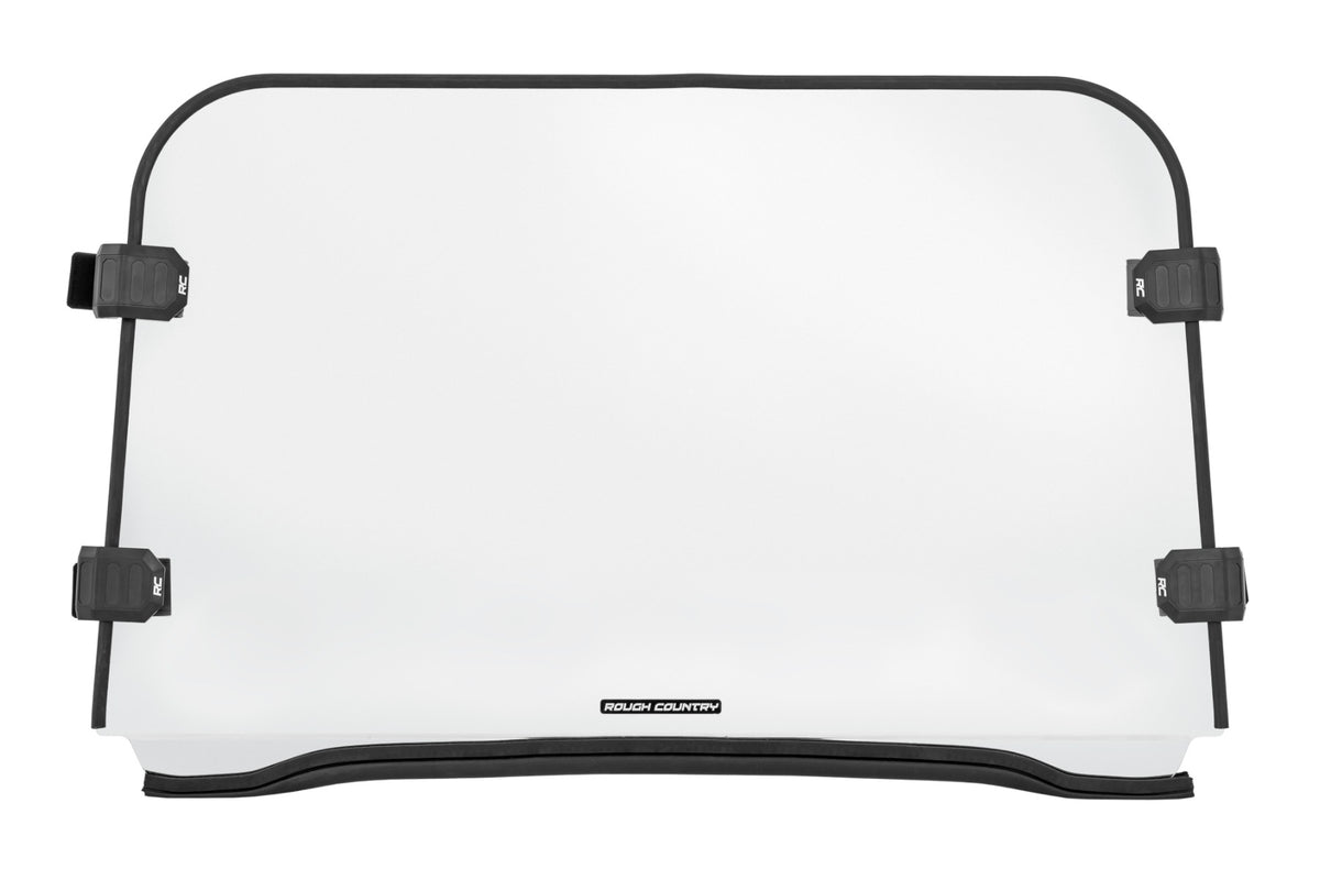 Added Protection and comfortability. Protect the occupants of your Polaris RZR 800 from off-road hazards such as rocks, branches, and other debris with Rough Country's Scratch-Resistant Windshields. UTV Windshields offer a clear visual of the trail ahead and allow for a much more comfortable outing!\ High-Quality Polycarbonate Construction. Rough Country UTV windshields are constructed from thick polycarbonate material that is precision cut for a perfect fit. The polycarbonate material provides an ideal combination of clarity, flexibility, durability that outperforms glass, acrylic, and other windshield materials.\ Durable Scratch and UV Resistance. Each windshield is not only constructed from thick polycarbonate material but enhanced by a secondary AR2 hard-coating process. This process completely coats the windshield with a hardened, scratch-resistant barrier. This treatment also provides the additional benefit of UV protection.\ Easy Installation. With a simple strap-on installation process, installing a Rough Country windshield couldn't be easier. Within 15 ?Çô 30 mins you can be ready to hit the trails.\ Limited-Lifetime Replacement Warranty. Rough Country's Scratch-Resistant Windshields are backed with a limited lifetime replacement warranty towards manufacturer defects. As such, the product is protected from structural and workmanship damage after the date of purchase. With our industry-leading warranty give yourself peace of mind when using Rough Country's Suspension products!