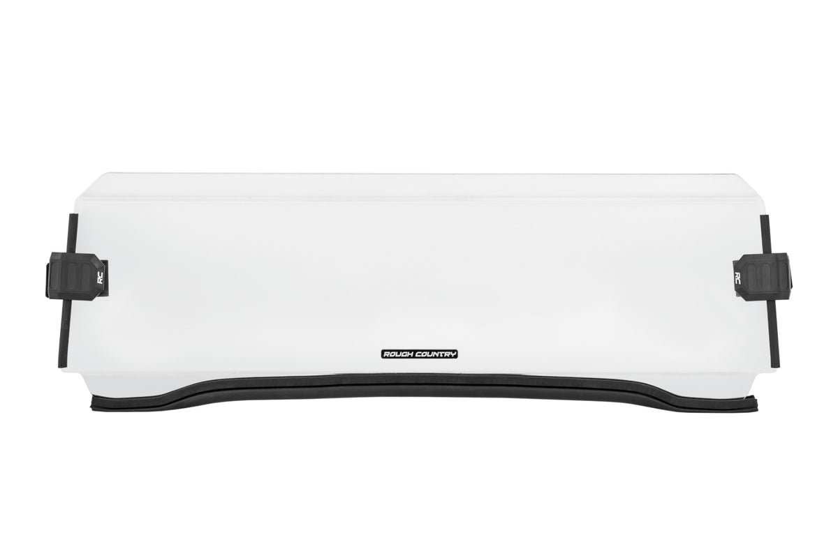 - Width: 39.5" Height: 13.19" Durable, polycarbonate construction. Contoured design. Rubber seal for a precise fit. Works with factory or aftermarket roofs. Easy to install.