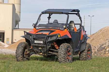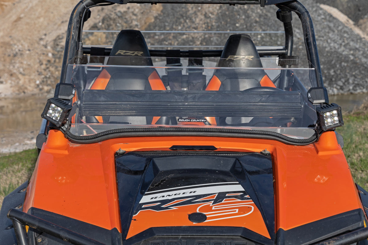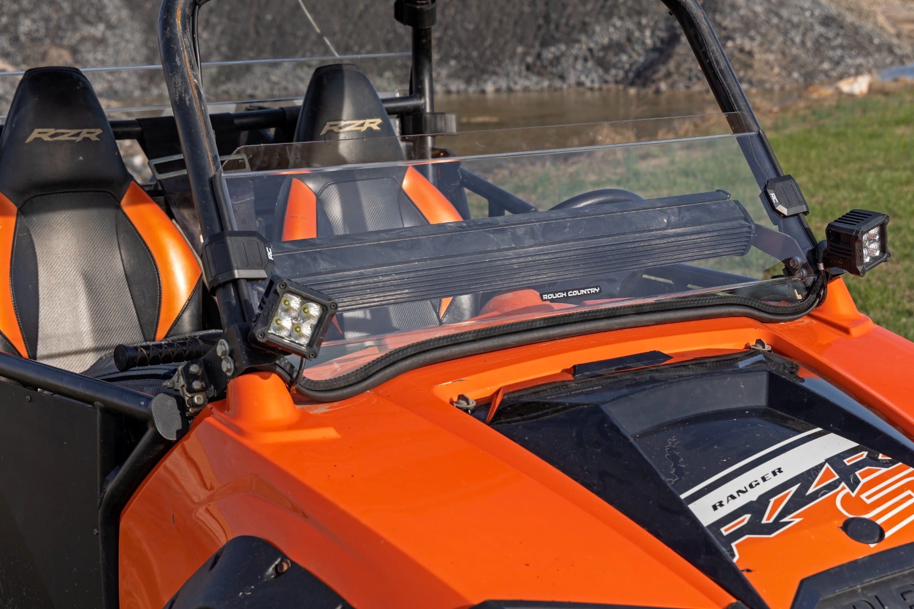 Added Protection and comfortability. Protect the occupants of your Polaris RZR 800 from off-road hazards such as rocks, branches, and other debris with Rough Country's Scratch-Resistant Windshields. UTV Windshields offer a clear visual of the trail ahead and allow for a much more comfortable outing!\ High-Quality Polycarbonate Construction. Rough Country UTV windshields are constructed from thick polycarbonate material that is precision cut for a perfect fit. The polycarbonate material provides an ideal combination of clarity, flexibility, durability that outperforms glass, acrylic, and other windshield materials.\ Durable Scratch and UV Resistance. Each windshield is not only constructed from thick polycarbonate material but enhanced by a secondary AR2 hard-coating process. This process completely coats the windshield with a hardened, scratch-resistant barrier. This treatment also provides the additional benefit of UV protection.\ Easy Installation. With a simple strap-on installation process, installing a Rough Country windshield couldn't be easier. Within 15 ?Çô 30 mins you can be ready to hit the trails.\ Limited-Lifetime Replacement Warranty. Rough Country's Scratch-Resistant Windshields are backed with a limited lifetime replacement warranty towards manufacturer defects. As such, the product is protected from structural and workmanship damage after the date of purchase. With our industry-leading warranty give yourself peace of mind when using Rough Country's Suspension products!