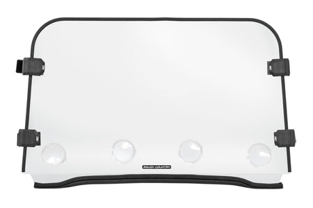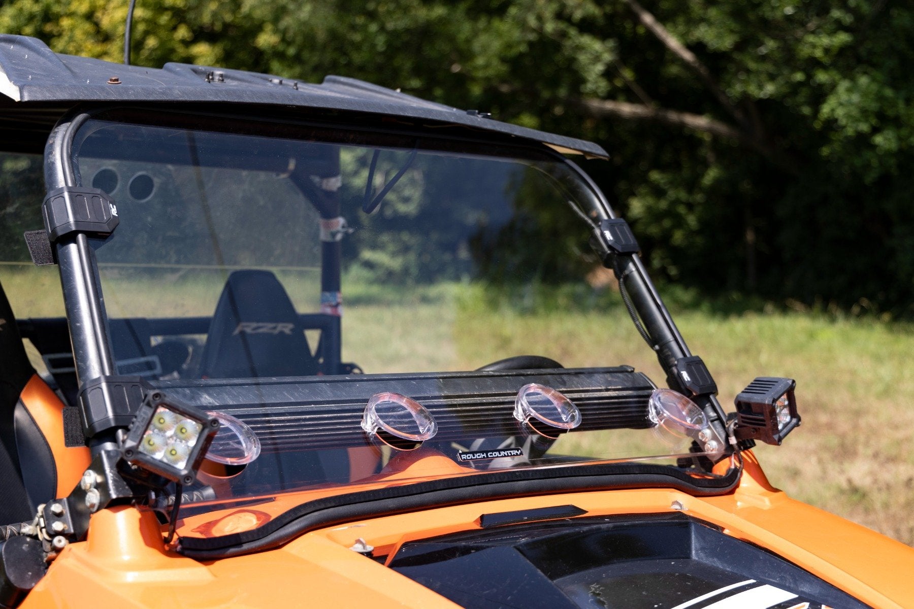 Added Protection and comfortability. Protect the occupants of your Polaris RZR 800 from off-road hazards such as rocks, branches, and other debris with Rough Country's Scratch-Resistant Windshields. UTV Windshields offer a clear visual of the trail ahead and allow for a much more comfortable outing!\ High-Quality Polycarbonate Construction. Rough Country UTV windshields are constructed from thick polycarbonate material that is precision cut for a perfect fit. The polycarbonate material provides an ideal combination of clarity, flexibility, durability that outperforms glass, acrylic, and other windshield materials.\ Durable Scratch and UV Resistance. Each windshield is not only constructed from thick polycarbonate material but enhanced by a secondary AR2 hard-coating process. This process completely coats the windshield with a hardened, scratch-resistant barrier. This treatment also provides the additional benefit of UV protection.\ Easy Installation. With a simple strap-on installation process, installing a Rough Country windshield couldn't be easier. Within 15 ?Çô 30 mins you can be ready to hit the trails.\ Limited-Lifetime Replacement Warranty. Rough Country's Scratch-Resistant Windshields are backed with a limited lifetime replacement warranty towards manufacturer defects. As such, the product is protected from structural and workmanship damage after the date of purchase. With our industry-leading warranty give yourself peace of mind when using Rough Country's Suspension products!
