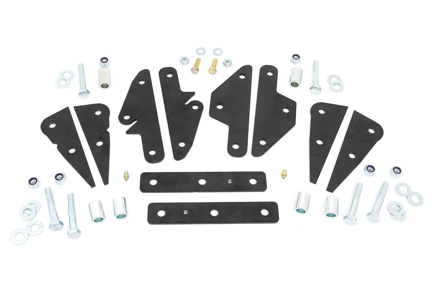 Tackle tough trails and run taller tires with Rough Country?ÇÖs 3in Lift Kit for Polaris Ranger. This durable lift kit provides a full 3-inches of lift from front to rear to give your UTV increased ride height and a more aggressive appearance.\ This 3-inch Polaris Ranger Lift Kit features a durable strut relocation brackets that install onto the factory strut along with front and rear lift brackets to provide enough lift height to run up to 28-inch tires. This increased ride height allows you to customize the look of your Ranger with a wealth of great aftermarket tire/wheel combos to give your vehicle a one-of-a-kind look and feel.\ This kit also includes a set of sway bar drop brackets to keep everything at the optimum angle after lifting. Includes a Lifetime Replacement Guarantee!
