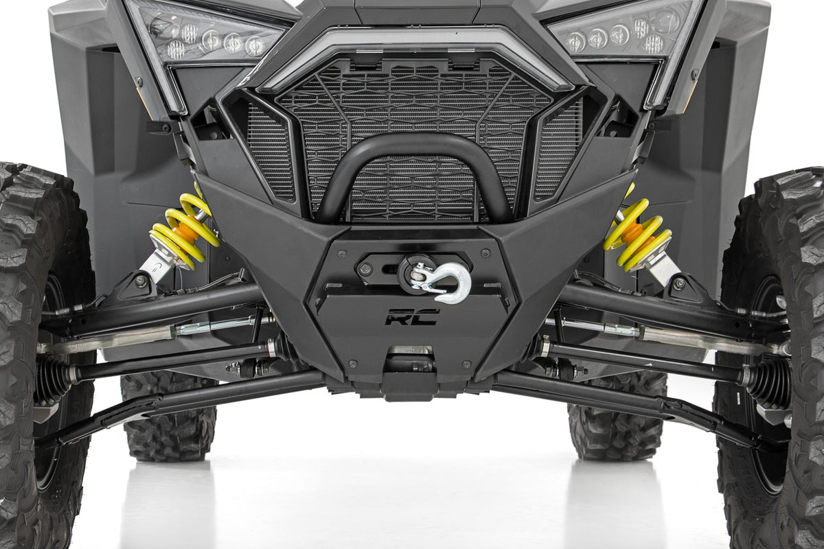 Gain peace of mind on the trail and overcome off-road obstacles with ease with Rough Country?ÇÖs RZR PRO XP Winch Mounting Plate. This easy-to-install kit upgrades your UTV with essential recovery capabilities for when you need it most.\ Made of a durable 1/4?ǥ steel construction, this heavy duty winch plate features dual mounting bolt patterns designed to firmly fit 3,500lb-5,000lb winches so you can choose the exact setup you require. Each plate is powder coated black to ward off the elements and provide a long lifespan of good looks and performance.\ Installation is a breeze, with no drilling required! Simply bolt-on this upgrade and attach your winch and you?ÇÖre ready for whatever the trail throws your way.