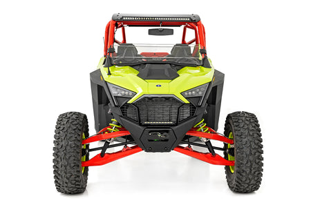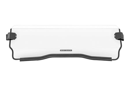 Added Protection and comfortability. Protect the occupants of your Polaris RZR from off-road hazards such as rocks, branches, and other debris with Rough Country's Scratch-Resistant Windshields. UTV Windshields offer a clear visual of the trail ahead and allow for a much more comfortable outing!\ High-Quality Polycarbonate Construction. Rough Country UTV windshields are constructed from thick polycarbonate material that is precision cut for a perfect fit. The polycarbonate material provides an ideal combination of clarity, flexibility, durability that outperforms glass, acrylic, and other windshield materials.\ Durable Scratch and UV Resistance. Each windshield is not only constructed from thick polycarbonate material but enhanced by a secondary AR2 hard-coating process. This process completely coats the windshield with a hardened, scratch-resistant barrier. This treatment also provides the additional benefit of UV protection.\ Easy Installation. With a simple strap-on installation process, installing a Rough Country windshield couldn't be easier. Within 15 ?Çô 30 mins you can be ready to hit the trails.\ Limited-Lifetime Replacement Warranty. Rough Country's Scratch-Resistant Windshields are backed with a limited lifetime replacement warranty towards manufacturer defects. As such, the product is protected from structural and workmanship damage after the date of purchase. With our industry-leading warranty give yourself peace of mind when using Rough Country's Suspension products!