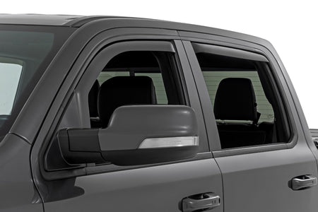 Upgrade your driving comfort with Rough Country's premium in-channel wind deflectors, designed for easy installation and exceptional performance. They fit seamlessly into your vehicle's window channels maintaining a sleek profile while letting you enjoy fresh air in any weather. Say goodbye to noisy wind and turbulence for a quieter cabin on city commutes or road trips. Our deflectors reduce glare and keep your interior dry with windows cracked open. They blend seamlessly with your vehicle's design for a stylish look and are custom-made for a perfect fit and reliable performance, ensuring every drive is comfortable and enjoyable.