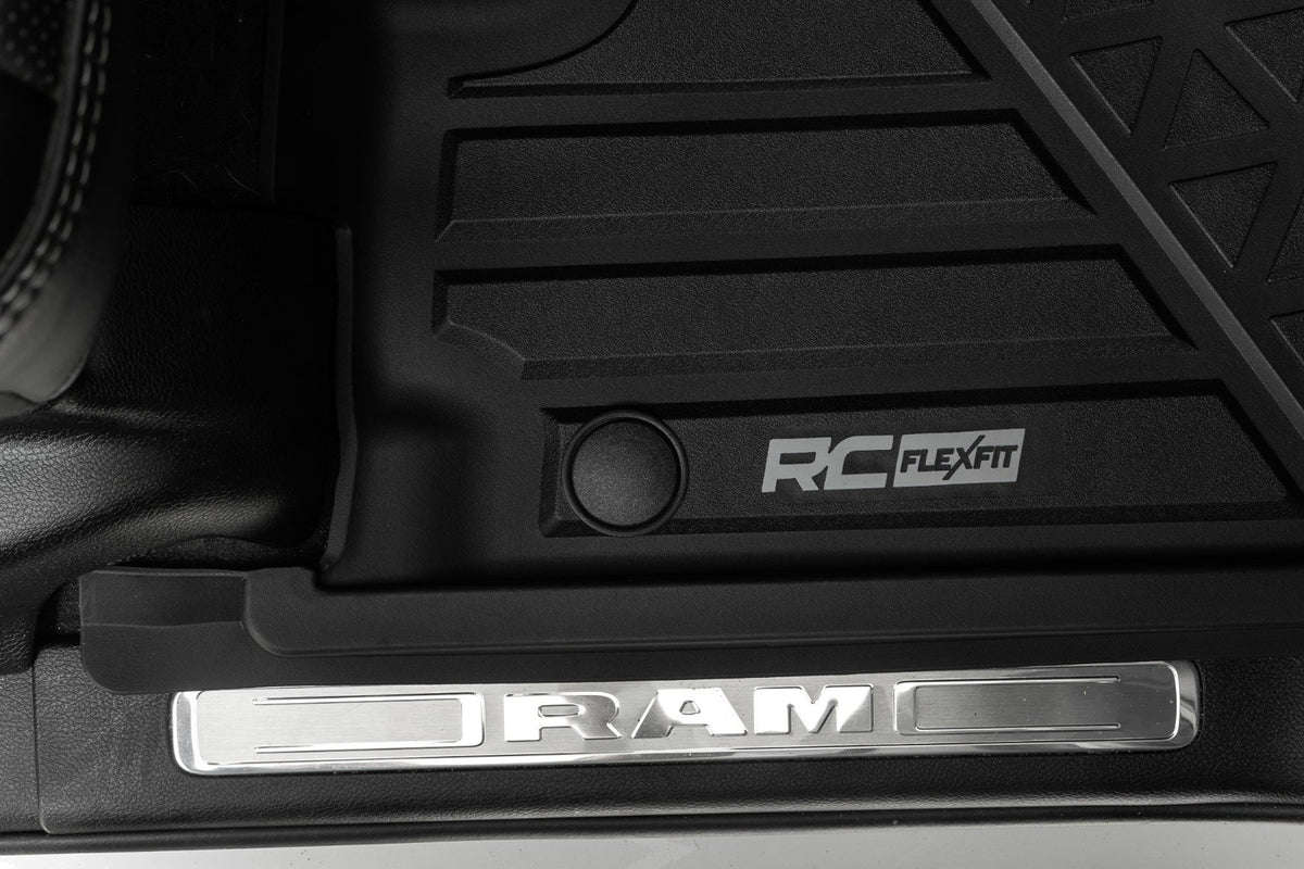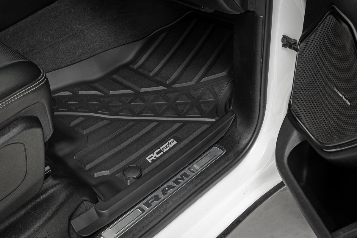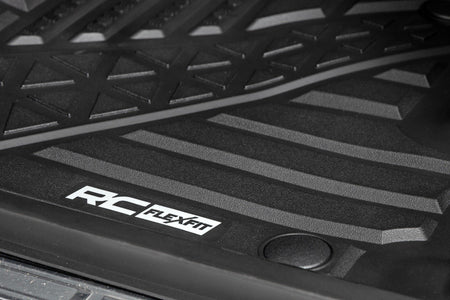 Introducing Flex-Fit floor mats ?Çö the ultimate enhancement for your truck's interior and built tough to handle any challenge. Crafted from premium rubber-like material, these mats are as durable as they come, perfectly tailored to fit your truck's unique shape for a seamless finish.\ Stock floor mats just don't cut it for adventurers. They get trashed by mud, don't hold up to spills, and leave your carpets a mess. Give your ride the all-weather protection it deserves with Rough Country's Flex-Fit Floor Mats, the perfect solution for keeping your vehicle clean and protected.\ All-Weather Protection: Engineered to fit your vehicle perfectly, these mats provide top-notch defense against snow, mud, sand, saltwater, and more.\ Spill Saver Lip: Don't sweat the spills! Our mats feature a Spill Saver Lip that prevents liquids from reaching your carpet, so you can enjoy your coffee on the go without worry.\ Non-Slip, Textured Surface: Stay in control no matter the terrain with our mats' non-slip, textured surface, designed to keep your feet firmly planted while driving.\ Easy to Clean and Maintain: Cleaning up is a breeze! These mats are detachable and easy to clean, so you can spend less time on maintenance and more time hitting the road.\ Premium Materials: Constructed from a rubber-like TPE material, these mats are built to withstand extreme temperatures without cracking or warping. They will stay flexible and functional for the long haul.\ Effortless Installation: Forget wrestling with bulky mats. Flex-Fit Mats slide right into place for a quick and frustration-free installation.\ Upgrade your truck's defense against the elements with Rough Country's Flex-Fit Floor Mats. They'll keep your carpets looking fresh and give you peace of mind on every adventure.