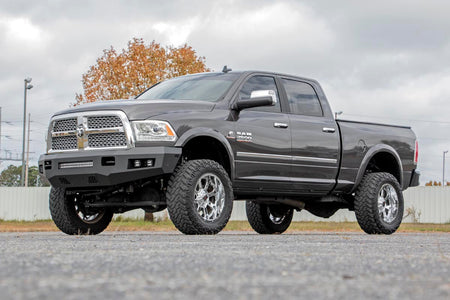 Give the front of your Ram an aggressive, new appearance with Rough Country?ÇÖs Front LED Bumper. This easy-to-install upgrade gives your truck an improved look and better protection that offer impressive off-road illumination! Rough Country?ÇÖs Front LED Bumper is made of a durable, all-steel construction. Each bumper features four Rough Country 2in LED Cubes and a 20in LED Light Bar that offer over 15,000 lumens of combined lighting power. Each bumper also includes sensor relocators to allow you to retain the vehicle?ÇÖs anti-collision system. This incredible front bumper system is powder coated flat black and is ready to withstand the elements for a long lifespan of good looks. Rough Country?ÇÖs Front LED Bumper is also easy to install with no cutting or drilling required! Complete the look with Rough Country?ÇÖs Rear LED Bumper for a total transformation of your truck.