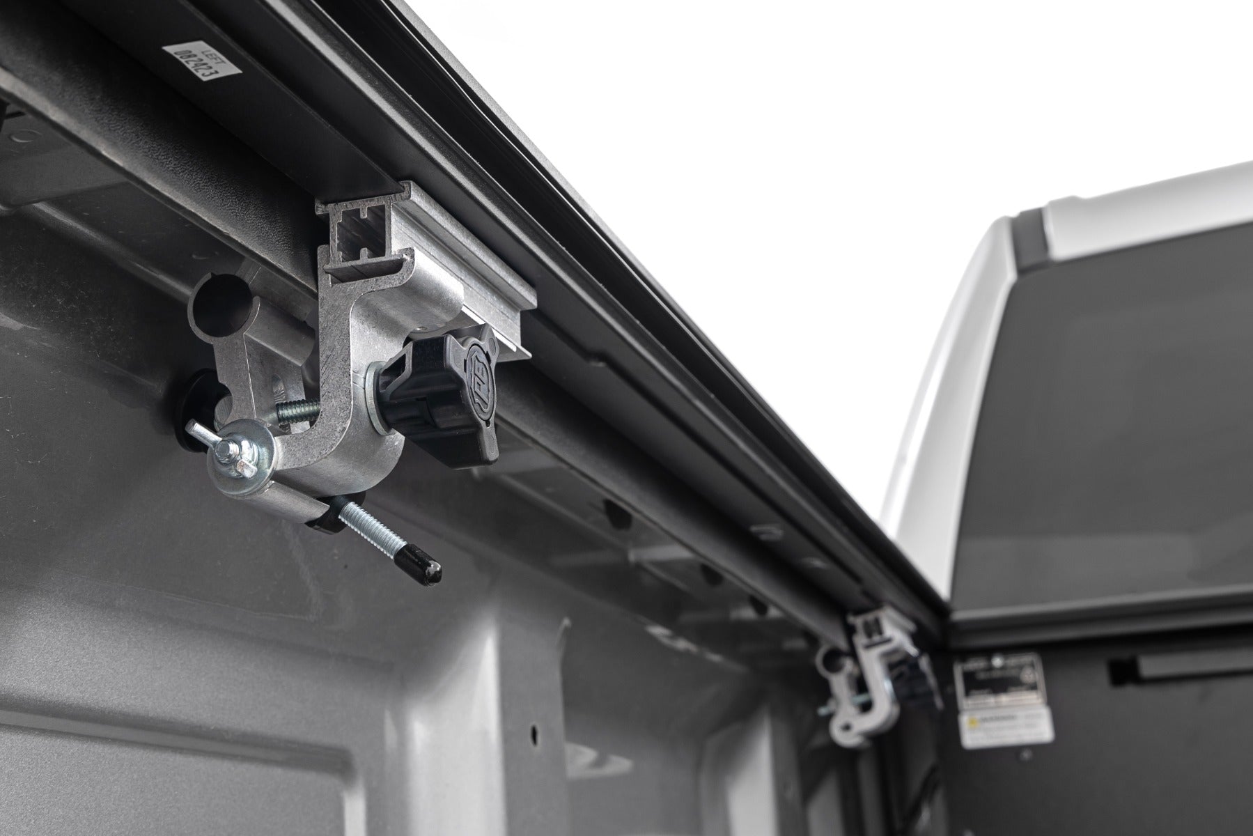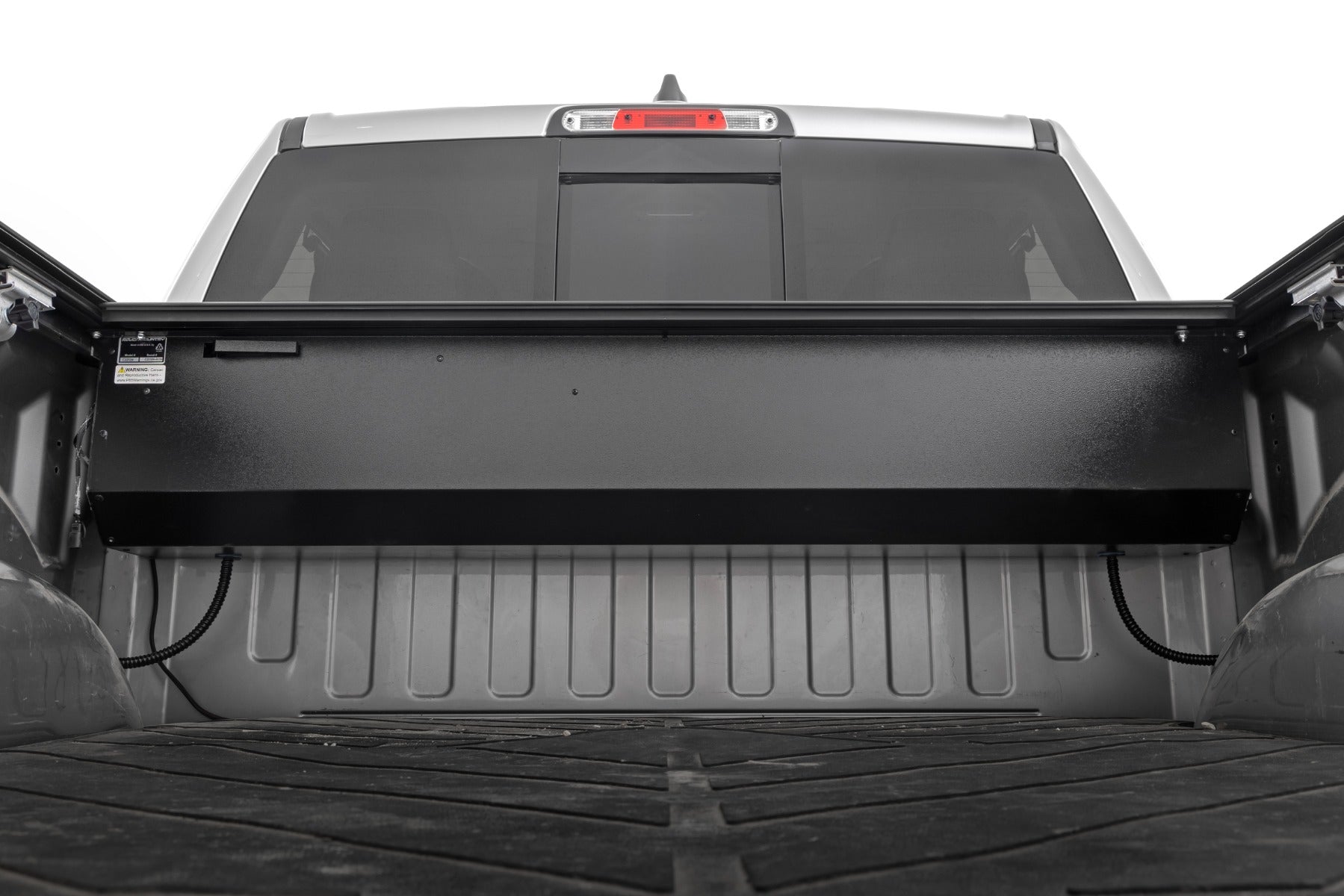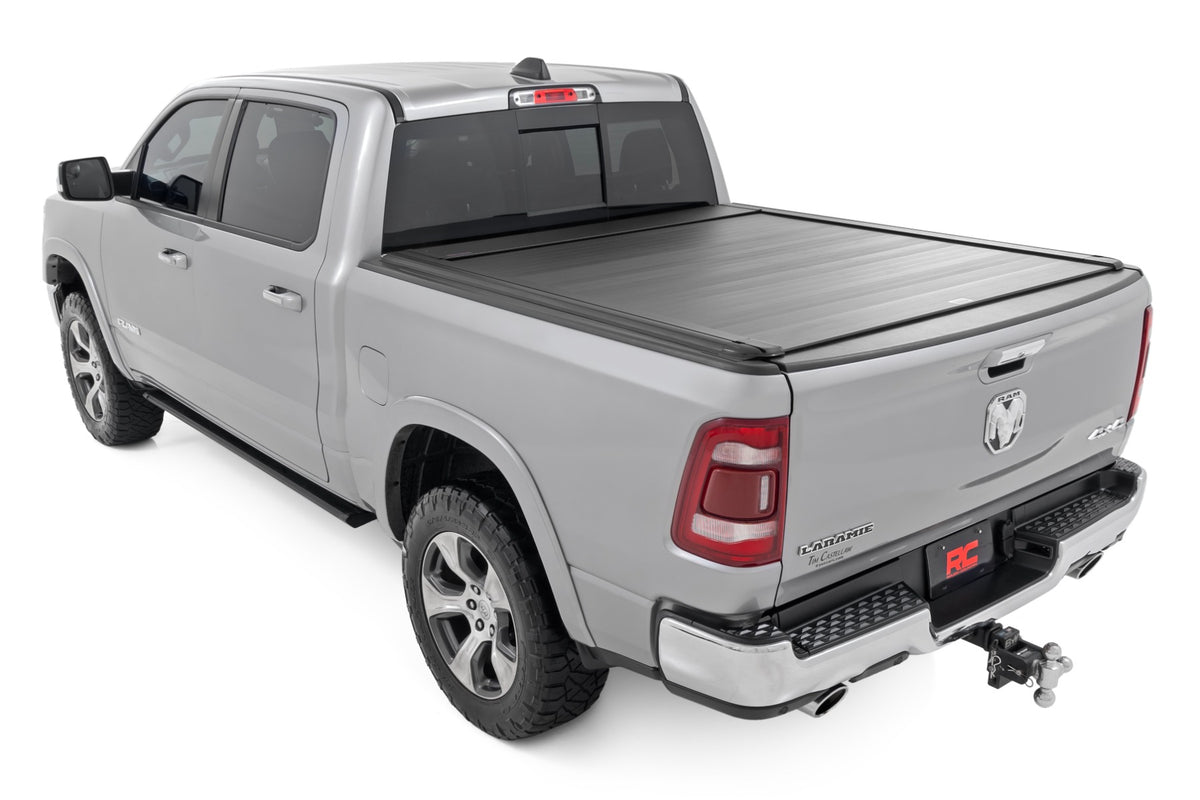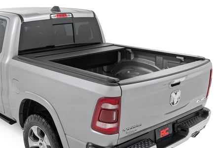 Every truck owner knows the importance of securing and protecting their gear, especially when they're out conquering trails or venturing into the wild. With the Powered Retractable Bed Cover for the fifth-generation Ram 1500, you not only protect your equipment from unpredictable weather but also add an unmatched layer of security and style to your truck. Engineered with precision in mind, our bed cover has been crafted to serve you whether you're on smooth highways or rough trails.Lock Your Cover in Any Position: With its unique electromagnetic brake, you can lock the cover at any point along the rails, offering flexibility based on your storage needs.Nearly Full Bed Access: Maximizing your truck?ÇÖs storage potential, the cover smoothly retracts to provide almost complete bed access.Heavy-Duty Aluminum Construction: Built to last, this bed cover is crafted from rugged aluminum and has a Matte black finish, ensuring it stands up to both daily wear and more intense outdoor challenges.UV Protection: The bed cover comes with UV protection, ensuring that it doesn?ÇÖt fade over time, keeping it looking as pristine as the day you installed it.Remote Key Fob for Easy Entry: Access your truck bed with just a click! The remote key fob integration ensures you can quickly and easily open or close your bed cover, even from a distance.Rough Country?ÇÖs Powered Retractable Bed Cover gives you the confidence of knowing your truck's looking its best and your gear's under wraps.