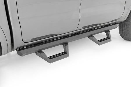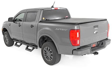 Innovative adjustable design. It's time to put your lifted vehicle a step ahead of the others! Rough Country's new SRX2 Side Steps are the perfect upgrade for your Ford Ranger. Constructed with an innovative slotted rail system, our hoop steps are easily adjustable. Simply slide the footpad left or right along the rail until it is at the perfect position to hop in and out.\ Durable and Affordable. Our aluminum adjustable steps are long-lasting, corrosion-resistant, and a high-quality option at an affordable price. Powder-coated for added protection from the elements, the SRX2 aluminum steps and bar also improve the look of your truck by hiding the body pinch-weld and frame.\ Installation: Adjustable side steps can be easily installed with an estimated 1-2 hours install time.\ Warranty: Rough Country's SRX2 Aluminum Steps have a limited lifetime replacement warranty towards manufacturer defects. As such, the product is protected from structural and workmanship damage after the date of purchase. With our industry-leading warranty, give yourself peace of mind when using Rough Country's products for your truck.