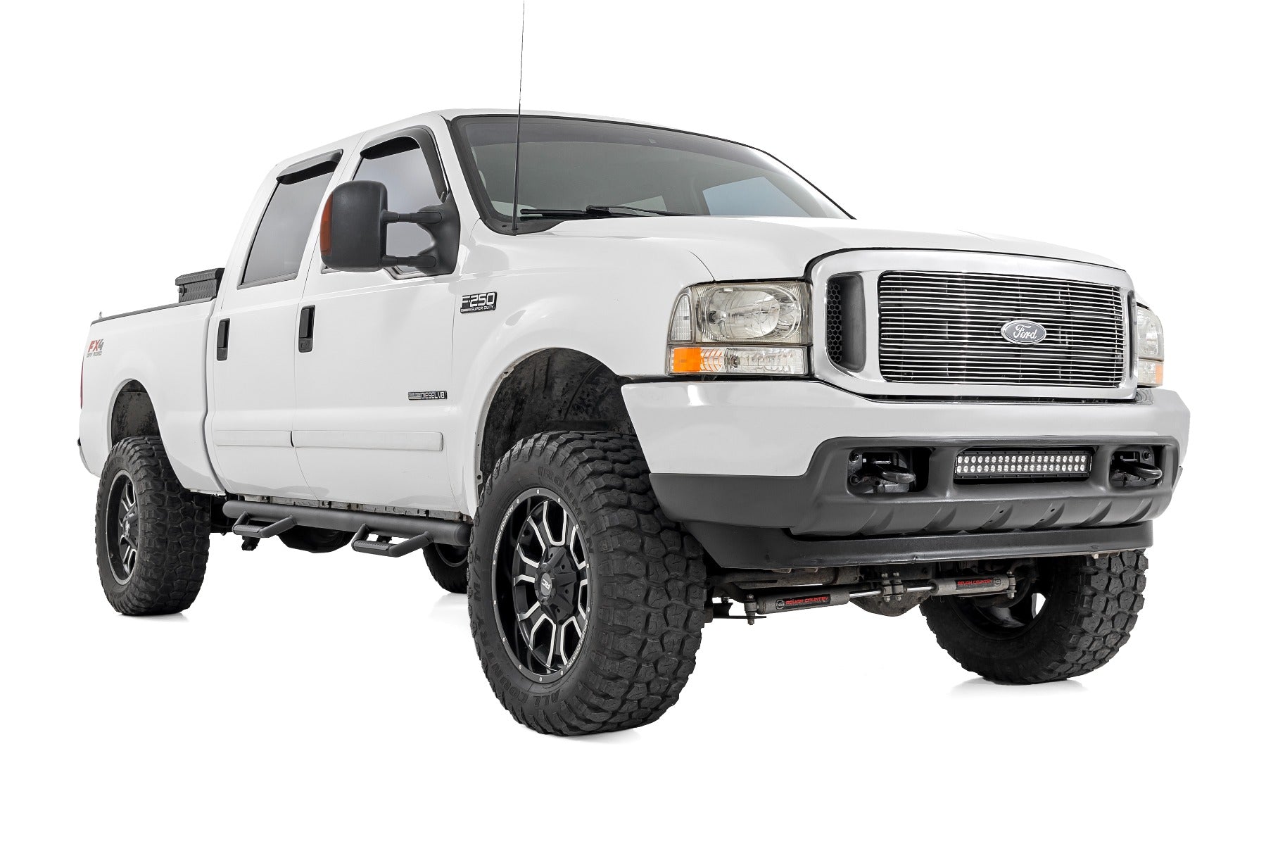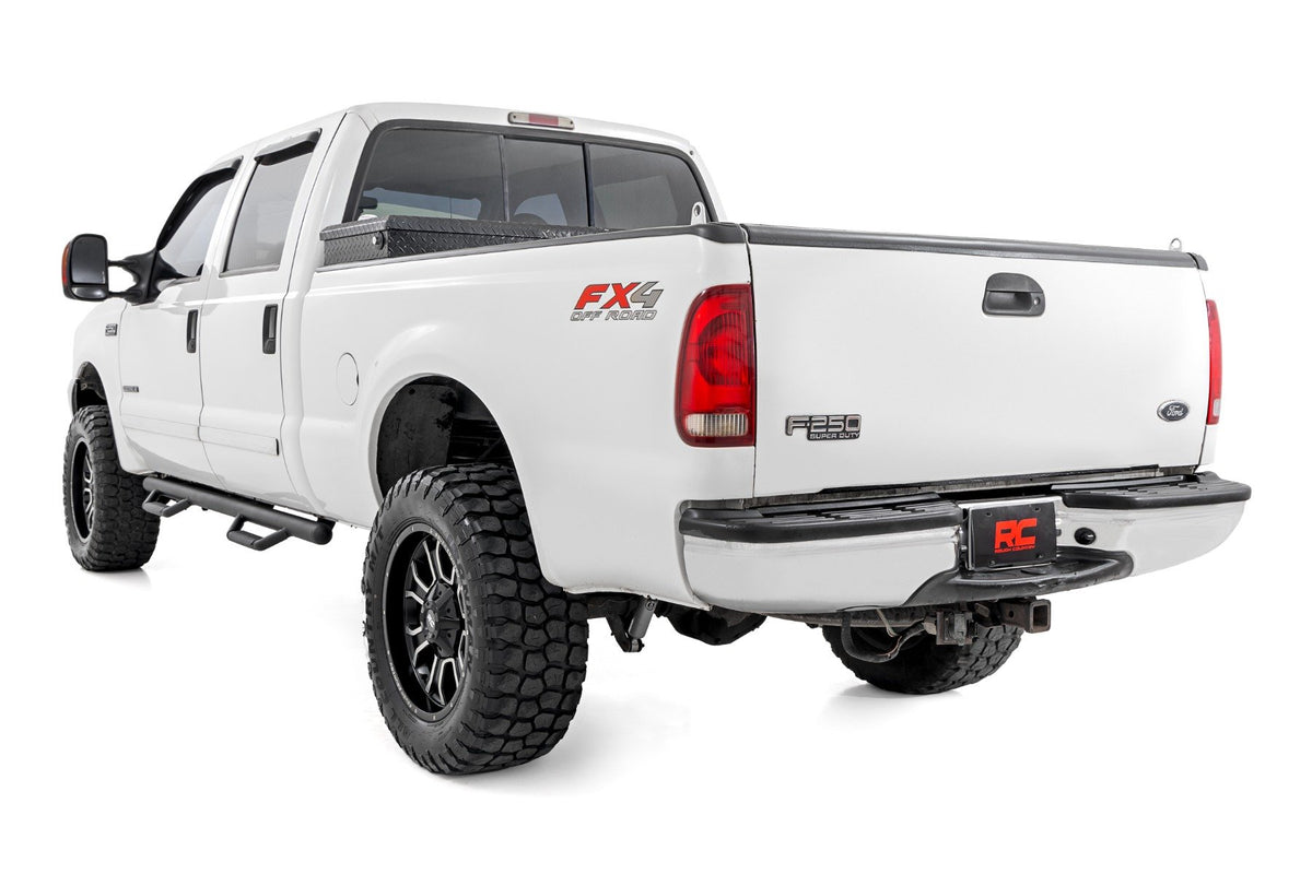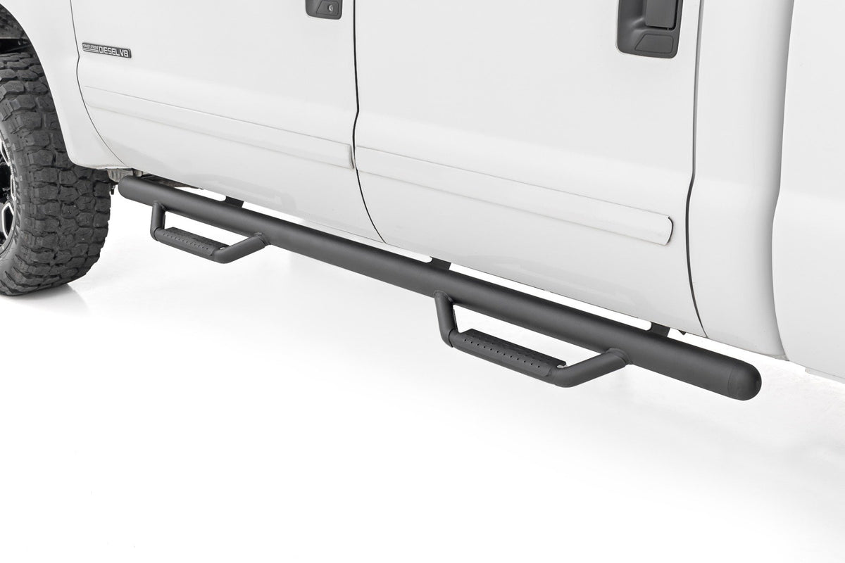 Rough Country's new Cab Length Nerf Steps provide unrelenting style and easier access to your truck. These steps extend the length of the cab of your truck, offering a clean install that lends to the look of your lifted truck. These steps can be installed on any vehicle, with or without a body lift. Our innovative design actually hides any exposed frame you see under the truck, offering extra protection for your rocker panels. Rough Country Nerf Steps are Made out of ultra-durable .084 Wall corrosion resistant tubing with a Zinc Base Coat and Black Finish for a sharp look that's ready to withstand the elements. Rough Country Steps include a Lifetime Replacement Warranty!