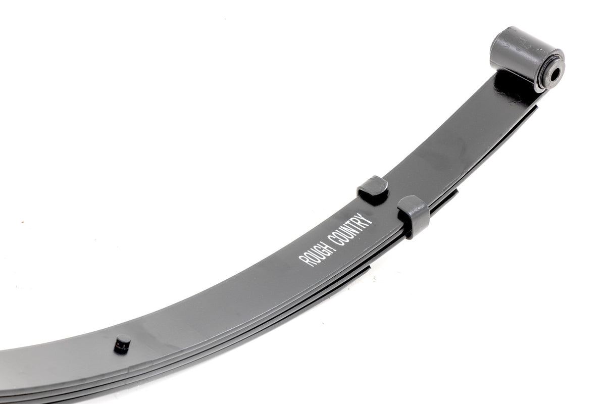 Added Lift Height and Ride Comfort. Take your suspension kit to the next level with Rough Country's Replacement Leaf Springs. Constructed from high-quality materials and designed specifically for the weight of your vehicle. This enhanced replacement spring will provide a factory-like feel while retaining your suspension lift height. Durable and Off-Road Ready. Rough Country's Replacement Leaf Springs are designed to tackle any terrain that they are faced with. Featuring a multi-leaf design and spring pads this reduces the friction and maximizes comfort. Each leaf pack utilizes tapered leaves for improved flexibility at their ends. Installation. Rough Country's Replacement Leaf Springs?áoffer a 100% bolt-on installation estimated to take approximately 1-2 hours depending on vehicle condition. Simply remove the pre-existing leaf spring and use the stock hardware to equip your vehicle with this high-quality replacement. Lifetime Replacement Warranty. Rough Country's Replacement Leaf is backed with a 5-year replacement warranty towards manufacturer defects. As such, the product is protected from structural and workmanship damage after the date of purchase. With our industry-leading warranty give yourself peace of mind when using Rough Country's Suspension products!