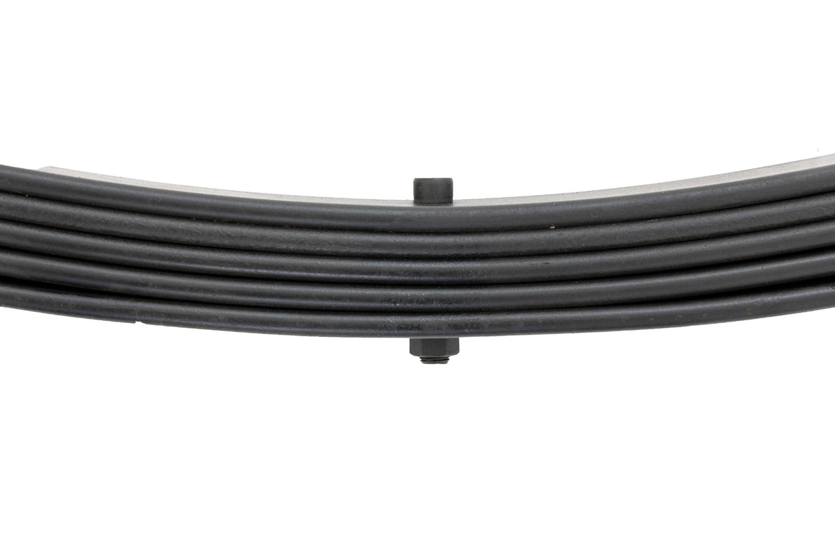 Added Lift Height and Ride Comfort. Take your suspension kit to the next level with Rough Country's Replacement Leaf Springs. Constructed from high-quality materials and designed specifically for the weight of your vehicle. This enhanced replacement spring will provide a factory-like feel while retaining your suspension lift height. Durable and Off-Road Ready. Rough Country's Replacement Leaf Springs are designed to tackle any terrain that they are faced with. Featuring a multi-leaf design and spring pads this reduces the friction and maximizes comfort. Each leaf pack utilizes tapered leaves for improved flexibility at their ends. Installation. Rough Country's Replacement Leaf Springs?áoffer a 100% bolt-on installation estimated to take approximately 1-2 hours depending on vehicle condition. Simply remove the pre-existing leaf spring and use the stock hardware to equip your vehicle with this high-quality replacement. Lifetime Replacement Warranty. Rough Country's Replacement Leaf is backed with a 5-year replacement warranty towards manufacturer defects. As such, the product is protected from structural and workmanship damage after the date of purchase. With our industry-leading warranty give yourself peace of mind when using Rough Country's Suspension products!