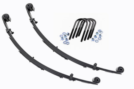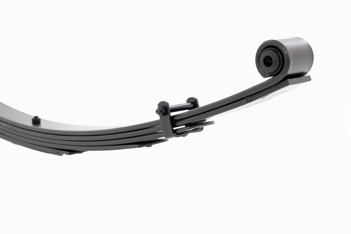 Added Lift Height and Ride Comfort. Take your suspension kit to the next level with Rough Country's Replacement Leaf Springs. Constructed from high-quality materials and designed specifically for the weight of your vehicle. This enhanced replacement spring will provide a factory-like feel while retaining your suspension lift height. Durable and Off-Road Ready. Rough Country's Replacement Leaf Springs are designed to tackle any terrain that they are faced with. Featuring a multi-leaf design and spring pads this reduces the friction and maximizes comfort. Each leaf pack utilizes tapered leaves for improved flexibility at their ends. Installation. Rough Country's Replacement Leaf Springs?áoffer a 100% bolt-on installation estimated to take approximately 1-2 hours depending on vehicle condition. Simply remove the pre-existing leaf spring and use the stock hardware to equip your vehicle with this high-quality replacement. Lifetime Replacement Warranty. Rough Country's Replacement Leaf is backed with a 5-year replacement warranty towards manufacturer defects. As such, the product is protected from structural and workmanship damage after the date of purchase. With our industry-leading warranty give yourself peace of mind when using Rough Country's Suspension products!