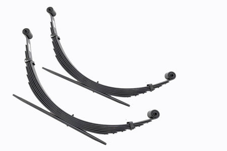 Added Lift Height and Ride Comfort. Take your suspension kit to the next level with Rough Country's Replacement Leaf Springs. Constructed from high-quality materials and designed specifically for the weight of your vehicle. This enhanced replacement spring will provide a factory-like feel while retaining your suspension lift height.?á\ Durable and Off-Road Ready. Rough Country's Replacement Leaf Springs are designed to tackle any terrain that they are faced with. Featuring a multi-leaf design and spring pads this reduces the friction and maximizes comfort. Each leaf pack utilizes tapered leaves for improved flexibility at their ends.?á\ Installation. Rough Country's Replacement Leaf Springs?áoffer a 100% bolt-on installation estimated to take approximately 1-2 hours depending on vehicle condition. Simply remove the pre-existing leaf spring and use the stock hardware to equip your vehicle with this high-quality replacement.?á\ Lifetime Replacement Warranty. Rough Country's Replacement Leaf is backed with a 5-year replacement warranty towards manufacturer defects. As such, the product is protected from structural and workmanship damage after the date of purchase. With our industry-leading warranty give yourself peace of mind when using Rough Country's Suspension products!?á