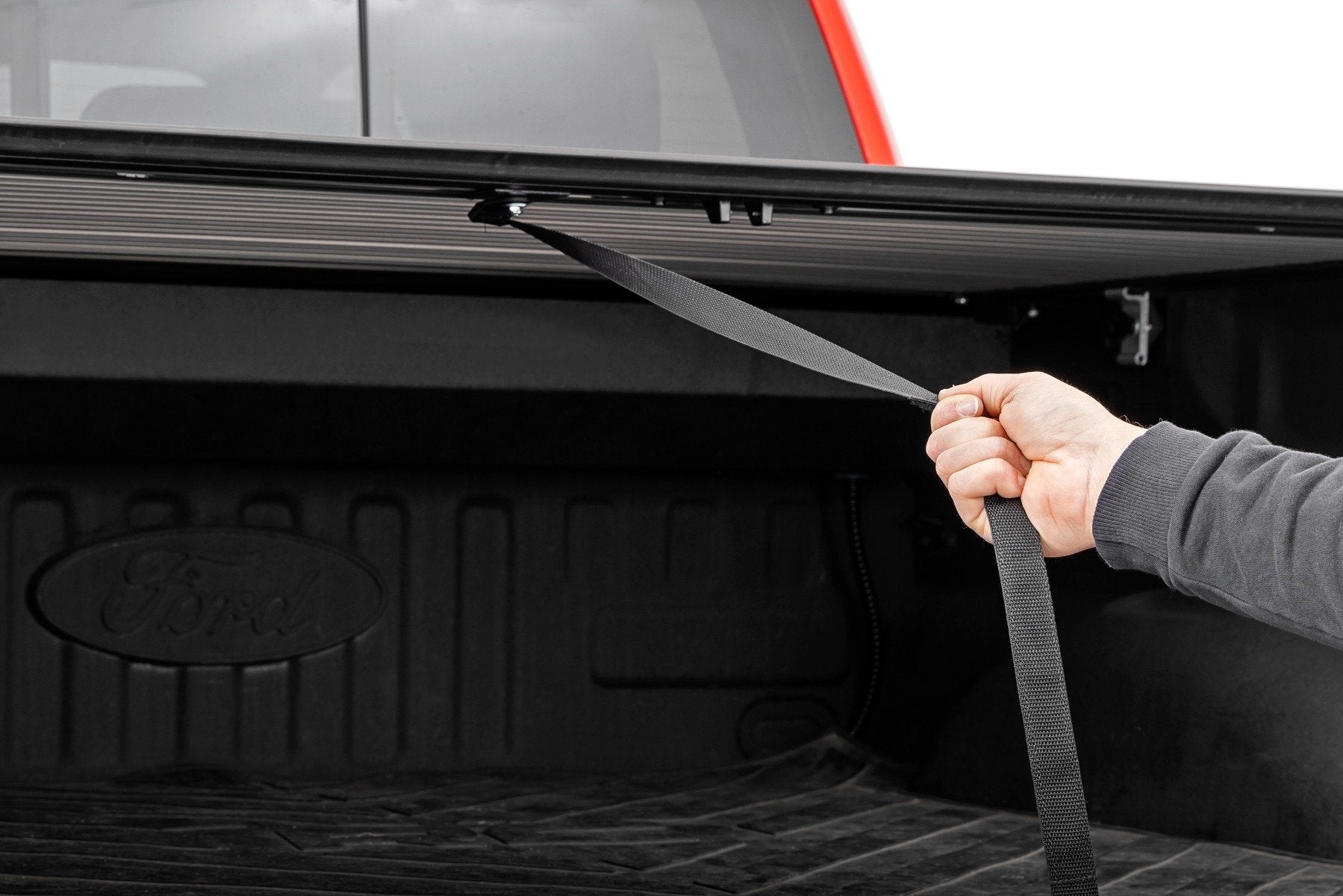 Superior Protection and Functionality. Protect your bed from weather and add security with Rough Country?ÇÖs sleek Retractable Bed Covers. Boasting a weather-resistant vinyl covering over a rigid aluminum panel design Rough Country's Retractable Covers sit firmly on the bed rails allowing for full rear visibility. These durable bed covers feature a flush, low-profile design that gives your truck a clean, sleek look while protecting the contents of your bed.\ Innovative Design. Each cover features a premium, matte black finish for uncompromised protection and killer good looks. The convenient retractable design allows easy access to your bed and the ability to haul large items without entirely removing the cover. Simply utilize the pull strap to retract the cover to gain access to your bed! This cover features a full-width handle that allows you to open or close the cover from either side of the bed. Each cover offers a tension spring that helps the cover retract smoothly and easily in seconds!?á\ \ Installation.?áWith a 100% bolt-on installation process, installation couldn't be easier. With an estimated timeframe of 1-2 hours, this cover can be installed at home using standard tools and can be completed efficiently and quickly!\ Five Year Warranty. Rough Country's Retractable Bed Covers are backed with a five-year warranty towards manufacturer defects. As such, the product is protected from structural and workmanship damage after the date of purchase. With our industry-leading warranty give yourself peace of mind when using Rough Country's Suspension products!