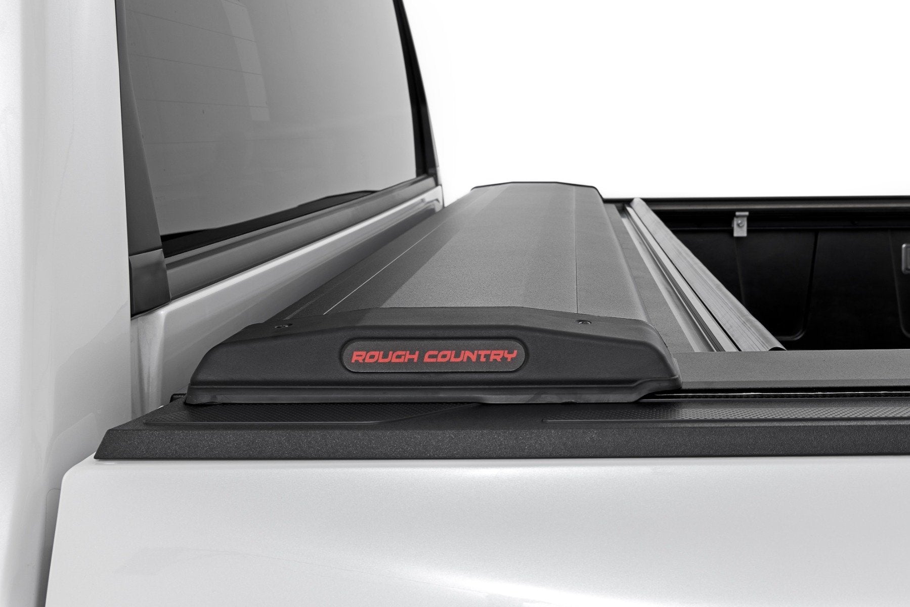 Superior Protection and Functionality. Protect your bed from weather and add security with Rough Country?ÇÖs sleek Retractable Bed Covers. Boasting a weather-resistant vinyl covering over a rigid aluminum panel design Rough Country's Retractable Covers sit firmly on the bed rails allowing for full rear visibility. These durable bed covers feature a flush, low-profile design that gives your truck a clean, sleek look while protecting the contents of your bed.\ Innovative Design. Each cover features a premium, matte black finish for uncompromised protection and killer good looks. The convenient retractable design allows easy access to your bed and the ability to haul large items without entirely removing the cover. Simply utilize the pull strap to retract the cover to gain access to your bed! This cover features a full-width handle that allows you to open or close the cover from either side of the bed. Each cover offers a tension spring that helps the cover retract smoothly and easily in seconds!?á\ \ Installation.?áWith a 100% bolt-on installation process, installation couldn't be easier. With an estimated timeframe of 1-2 hours, this cover can be installed at home using standard tools and can be completed efficiently and quickly!\ Five Year Warranty. Rough Country's Retractable Bed Covers are backed with a five-year warranty towards manufacturer defects. As such, the product is protected from structural and workmanship damage after the date of purchase. With our industry-leading warranty give yourself peace of mind when using Rough Country's Suspension products!