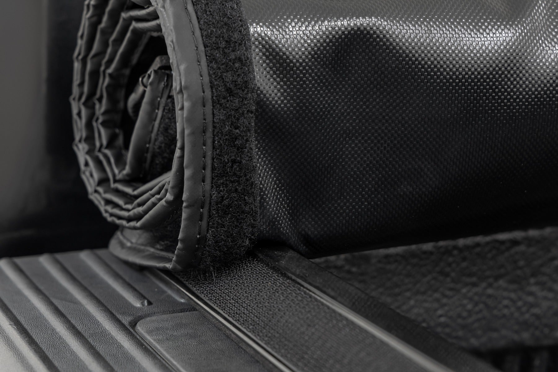 - High-quality marine grade vinyl bed cover in a stylish matte black finish. Roll-up design allows quick access to cargo and full bed access quickly and conveniently. Sleek and stylish top mount cover that sits 1-1/8" high. Corrosion resistant black powder coated aluminum frame. Spring latch closure system locks in place keeping the cover tight and noise free. Single cable pull for easy latch release and access. Heavy Duty hook and loop side closure protects cargo from the elements. No drill easy install and removal - all tools included. 5 Year Warranty.