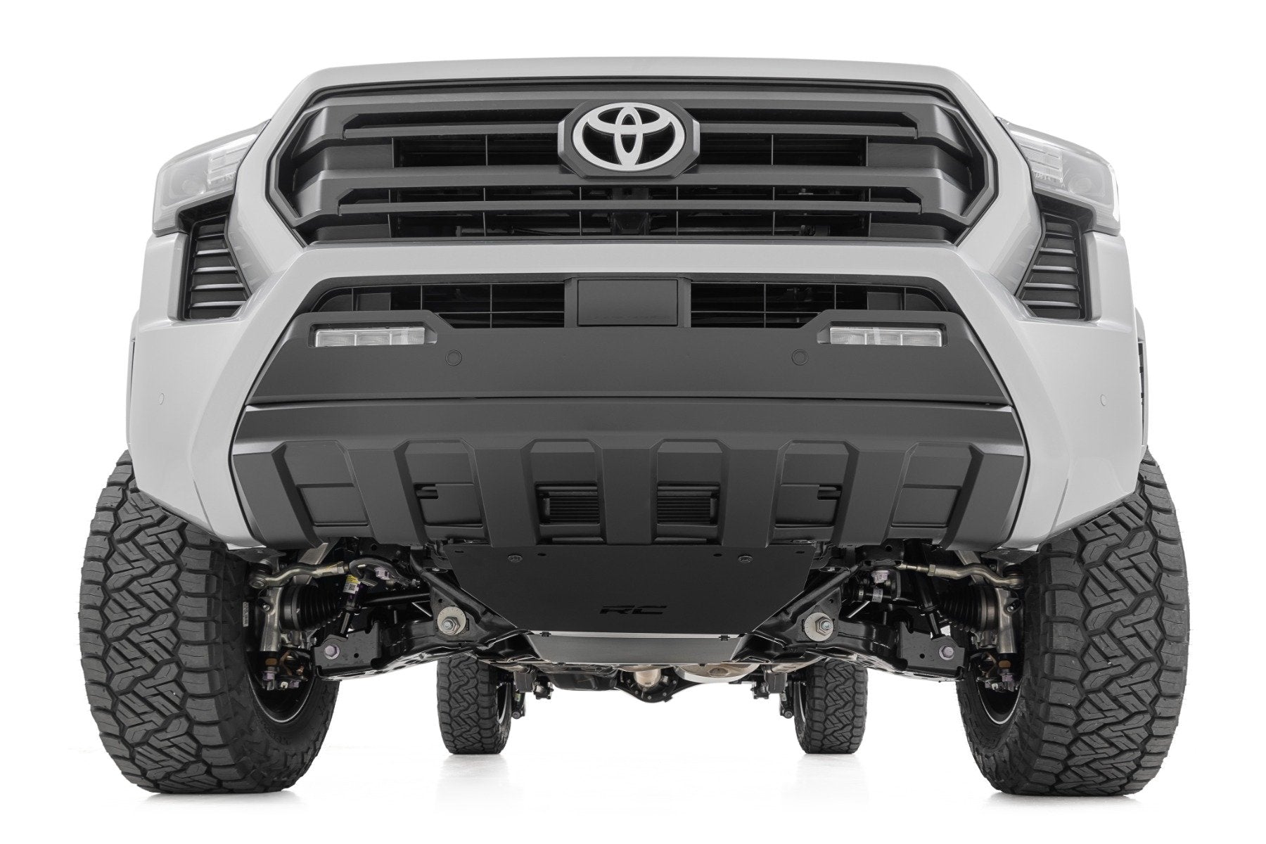 When you?ÇÖre out on the trail, you want to focus on the thrill of the ride, not worry about the rocks, stumps, and debris lurking underneath. The Rough Country Skid Plate for your fourth-generation Toyota Tacoma acts as your undercarriage's bodyguard, absorbing impact from everything nature throws at it, giving you peace of mind with heavy-duty armor so you can rip through the toughest trails.11-Gauge Steel Construction: Built from tough 11-gauge steel, this skid plate is ready to take a beating so your undercarriage doesn?ÇÖt have to. Go ahead?Çöchallenge the roughest terrain, it's built to handle it.Gloss Black Powder Coat: Not only does this plate protect, but it looks good doing it. The sleek gloss black powder coat finish resists rust, corrosion, and trail damage, keeping your truck looking sharp after every adventure.Fits Stock Tacoma Models: You don?ÇÖt have to jump through hoops to get this plate on your truck. It?ÇÖs a perfect fit for your stock height Tacoma, no complicated mods necessary.RC Shackle Mount Compatible: Already rocking Rough Country shackle mounts? No problem. This skid plate works seamlessly with your existing setup, making adding that extra layer of protection easier than ever.Built-In Differential Skid Plate: This kit comes with a differential skid plate too, so you?ÇÖre covered front to back. Those sneaky rocks and roots don?ÇÖt stand a chance.From smashing through mud to crawling over rocks, the Rough Country Skid Plate has your undercarriage covered. No more cringing at every bump?Çöjust a smooth ride wherever the trail takes you.