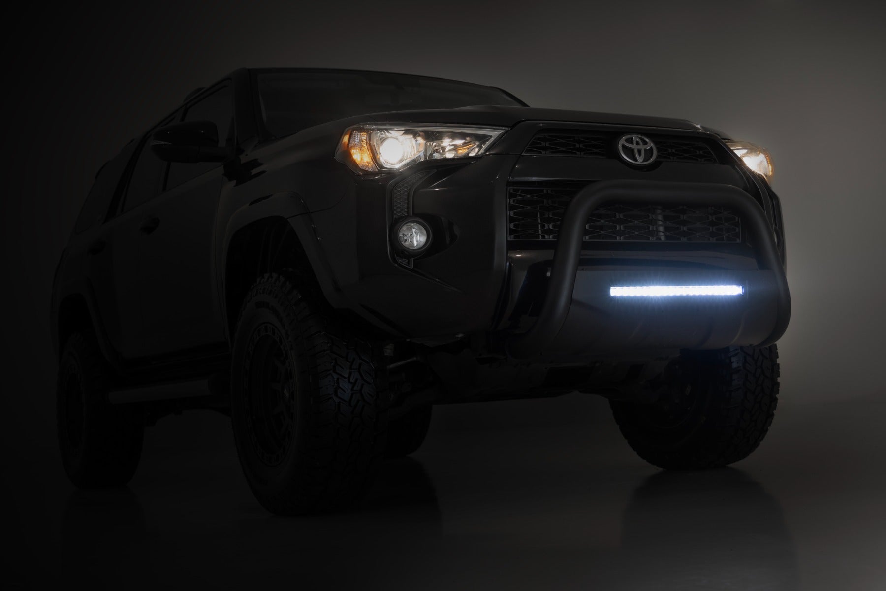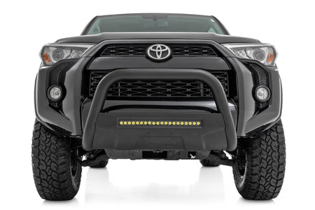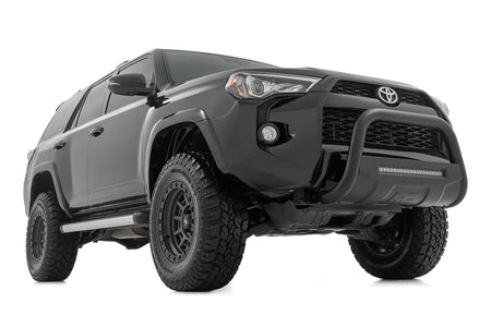It's the ultimate combination of form and function with Rough Country's durable, new Bull Bars. Protect the front end of your truck with our beefy yet stylish Bull Bar kit. Featuring a 3-inch diameter tube design and corrosion-resistant finish, this Bull Bar package offers superior protection from hazards of the road and trail.Features pre-drilled holes to easily add additional lighting. Rough Country's Bull Bars are easy to install, with a 100% bolt-on installation process that's easy enough to be done in a home garage with common tools. Each set of Rough Country Bull Bars is backed by Rough Country's 5-Year Warranty.