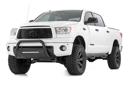 COMMAND THE DARK with Rough Country?ÇÖs new LED Bull Bar! This durable 3-inch thick tubular steel bull bar provides unbeatable protection for the front side of your vehicle, with an integrated Rough Country 20-inch Black-Series Single-Row LED Light bar to provide ample lighting for the trail ahead. This easy-to-install bull bar features a 100% bolt-on installation process, giving you a simple way to add this eye-catching upgrade that provides protection from hazards on and off-road. Each LED Bull Bar includes a removable license plate relocation bracket and corrosion-resistant black powder coat to ensure a long-lifespan for years to come. Rough Country's Single-Row 20-inch Black-Series LED light bar features Cree LEDs outputting a staggering 7200 Lumens and 90 watts of lighting power. Rough Country?ÇÖs all-weather LED lights feature a durable, die-cast aluminum housing and include a premium, waterproof, flat-wound, braided wiring harness with toggle switch and in-line fuse.