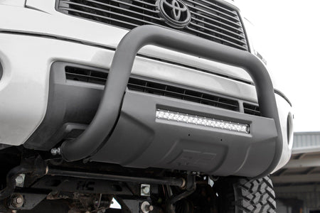 - Includes an integrated 20-inch Rough Country LED light bar, 90watt, 7200 lumens Easy bolt-on install 3-inch diameter steel tubing Corrosion resistant black powder coat Includes license plate adapter bracket Added protection for the front end of your vehicle Features stamped "RC" logo Bull bar features 5-year limited warranty Light bar features 3-year limited warranty