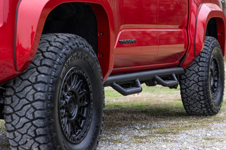 Climbing into your Tacoma shouldn't be a workout. Our all-new bolt-on Nerf Steps offer a secure step up, making getting in and out a breeze. Level up your fourth generation Tacoma with Rough Country's all-new bolt-on Nerf Steps.\ Enhanced Undercarriage Protection:?ǻSay goodbye to road debris or pesky obstacles damaging your ride, and hello to peace of mind. These Nerf Steps shield your Tacoma's undercarriage from debris, rocks, and whatever else lurks below.\ Integrated Stone Guards:?ǻWe've got your sides covered, too. Built-in stone guards deflect kicked-up rocks and debris, keeping your paint job pristine.\ Clean and Streamlined Design:?ǻThese Nerf Steps follow the contours of your cab for a close fit that looks sharp. No bulky bars here, just a sleek profile that complements your Tacoma's style.\ Built to Endure:?ǻConstructed from heavy-duty .084 wall corrosion-resistant tubing, these steps are ready to handle anything you throw at them. From mountain trails to mud bogs, they'll conquer it all.\ Body Lift Friendly:?ǻWhether you're rocking a stock ride or a lifted beast, these steps offer maximum versatility. They work seamlessly with or without a body lift.\ Easy Installation:?ǻDitch complicated setups. Our bolt-on design lets you install these steps in record time, getting you back on the road (or trail) faster.\ Limited Lifetime Warranty:?ǻRide with confidence knowing Rough Country's Limited Lifetime Warranty backs you up.\ Step up your Tacoma game with Rough Country Nerf Steps. Easy installation, exceptional protection, and a sleek design ?Çô what more could you ask for?