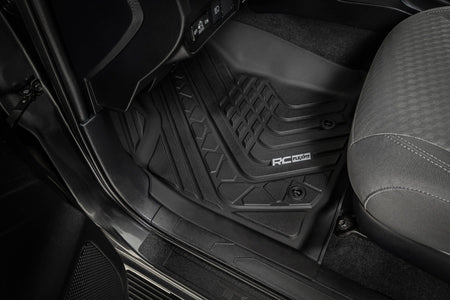 Introducing Flex-Fit floor mats ?Çö the ultimate enhancement for your truck's interior and built tough to handle any challenge. Crafted from premium rubber-like material, these mats are as durable as they come, perfectly tailored to fit your truck's unique shape for a seamless finish.\ Stock floor mats just don't cut it for adventurers. They get trashed by mud, don't hold up to spills, and leave your carpets a mess. Give your ride the all-weather protection it deserves with Rough Country's Flex-Fit Floor Mats, the perfect solution for keeping your vehicle clean and protected.\ All-Weather Protection: Engineered to fit your vehicle perfectly, these mats provide top-notch defense against snow, mud, sand, saltwater, and more.\ Spill Saver Lip: Don't sweat the spills! Our mats feature a Spill Saver Lip that prevents liquids from reaching your carpet, so you can enjoy your coffee on the go without worry.\ Non-Slip, Textured Surface: Stay in control no matter the terrain with our mats' non-slip, textured surface, designed to keep your feet firmly planted while driving.\ Easy to Clean and Maintain: Cleaning up is a breeze! These mats are detachable and easy to clean, so you can spend less time on maintenance and more time hitting the road.\ Premium Materials: Constructed from a rubber-like TPE material, these mats are built to withstand extreme temperatures without cracking or warping. They will stay flexible and functional for the long haul.\ Effortless Installation: Forget wrestling with bulky mats. Flex-Fit Mats slide right into place for a quick and frustration-free installation.\ Upgrade your truck's defense against the elements with Rough Country's Flex-Fit Floor Mats. They'll keep your carpets looking fresh and give you peace of mind on every adventure.