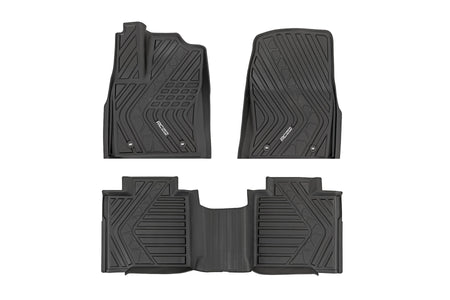 Introducing Flex-Fit floor mats ?Çö the ultimate enhancement for your truck's interior and built tough to handle any challenge. Crafted from premium rubber-like material, these mats are as durable as they come, perfectly tailored to fit your truck's unique shape for a seamless finish.\ Stock floor mats just don't cut it for adventurers. They get trashed by mud, don't hold up to spills, and leave your carpets a mess. Give your ride the all-weather protection it deserves with Rough Country's Flex-Fit Floor Mats, the perfect solution for keeping your vehicle clean and protected.\ All-Weather Protection: Engineered to fit your vehicle perfectly, these mats provide top-notch defense against snow, mud, sand, saltwater, and more.\ Spill Saver Lip: Don't sweat the spills! Our mats feature a Spill Saver Lip that prevents liquids from reaching your carpet, so you can enjoy your coffee on the go without worry.\ Non-Slip, Textured Surface: Stay in control no matter the terrain with our mats' non-slip, textured surface, designed to keep your feet firmly planted while driving.\ Easy to Clean and Maintain: Cleaning up is a breeze! These mats are detachable and easy to clean, so you can spend less time on maintenance and more time hitting the road.\ Premium Materials: Constructed from a rubber-like TPE material, these mats are built to withstand extreme temperatures without cracking or warping. They will stay flexible and functional for the long haul.\ Effortless Installation: Forget wrestling with bulky mats. Flex-Fit Mats slide right into place for a quick and frustration-free installation.\ Upgrade your truck's defense against the elements with Rough Country's Flex-Fit Floor Mats. They'll keep your carpets looking fresh and give you peace of mind on every adventure.