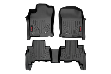 Keep your carpet in pristine condition with Rough Country's Floor Armor: Heavy Duty Floor Mats and Rear Cargo Liners. These eco-friendly, semi-flexible floor mats are made of an ultra-durable Polyethylene that offers a strong, rigid shape that's incredibly easy to clean.\ Where simple rubber floor mats fail, Rough Country's line of Floor Armor is guaranteed for life and will never crack, split, or break-down over time. The high-quality design extends the lifespan of your carpets and the raised-lip design ensures your interior will always be protected from mud, moisture, and more.\ These contoured floor mats are laser-measured for each make and model; designed to be a precise fit that grips the carpet and stays put. An aggressive looking textured surface gives your muddy shoes plenty of traction and looks great inside the vehicle.\ No matter what you track in, Rough Country Floor Armor is incredibly easy to clean. Just pop them out of the floorboards and rinse away the dirt! Includes Rough Country's Lifetime Replacement Warranty.