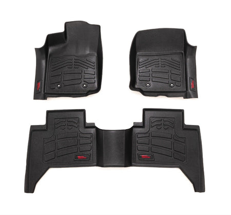 Keeping your ride spotless isn't always easy, especially with the unpredictable weather and accidental spills. Now you can ditch the dirt and keep your ride clean with Rough Country?ÇÖs Sure-Fit Floor Mats!\ All-Weather Protection: Our Sure-Fit Floor Mats are built to conquer any mess, from snow and mud to sand, salt water, and even that mystery puddle you're too afraid to touch. Spilled coffee? Don't sweat it! These mats feature a raised lip design that traps spills before they can reach your carpet. Plus, the textured surface keeps your feet firmly planted (no matter how messy things get).\ \ Sure-Fit Design: Made from tough Thermoplastic Rubber, these mats can handle anything you throw at them. They're flexible enough to contour perfectly to your Tacoma's floor, but strong enough to withstand even the most extreme temperatures. And the best part? They're custom-designed for your ride, so you get a perfect fit with extra coverage, whether you're rocking bucket or bench seats.\ \ Installation is a Breeze: Simply swap out your old mats and put ours in place. And they're just as easy to remove for cleaning, whether you're hitting them with the hose or giving them a quick vacuum. Made with pride in the USA using high-quality materials, they're built to withstand the test of time. And to show we stand behind our product, we offer a Limited Lifetime Warranty, so you can drive with confidence knowing your investment is protected.\ \ With Rough Country?ÇÖs Sure Fit Floor Mats you get the perfect combination of style, durability, and peace of mind, knowing your vehicle's floors are protected no matter where the road takes you. Life is messy, but your truck doesn't have to be.
