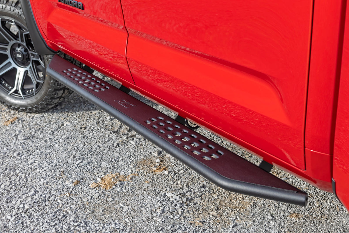 Rough Country?ÇÖs OV2 running board is the perfect combination of off-road style and function. These heavy-duty steel steps feature a rugged tubular construction for strength and rocker panel protection while still boasting a large area for secure footing. With rugged construction and easy installation, it's time to elevate your Toyota Tundra's performance and style.Rugged Durability: Made from durable steel and wrapped with a tubular side wall, the OV2 Running Boards offer reliable protection against rocks and debris the trail throws your way. The 1 ?? inch steel tubing provides added body protection, ensuring your Tundra stays in top condition no matter where you go.Ample Stepping Area: With a generous 6 3/4-inch-wide stepping area, these running boards offer plenty of foot room, making it easy to enter and exit your Tundra, even with mud-caked boots.Corrosion Resistance: Finished with a durable powder coat, our running boards are built to withstand the elements and resist corrosion, so they?ÇÖll look great for years to come.Easy Installation: Say goodbye to complicated installations. The OV2 Running Boards feature a no-drill installation process, allowing you to equip your Tundra for off-road adventures without the hassle.Peace of Mind: Rough Country stands behind the OV2 Running Boards with a limited lifetime warranty, so you can trust that our boards are a reliable investment for your Tundra.Whether you're navigating rocky trails or cruising through mud and sand, these running boards are the ultimate off-road companion, providing a sure step and unmatched protection for your rig.