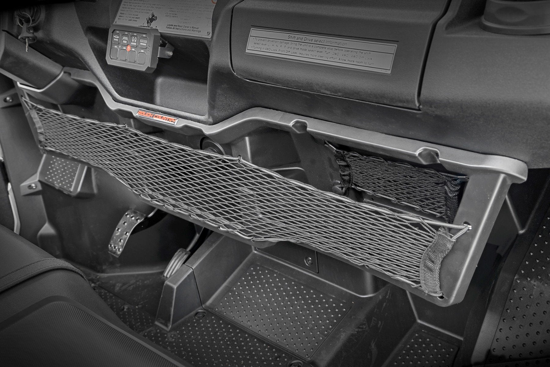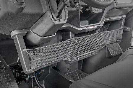 Added Storage. Carrying your essentials in your UTV should never be an issue when taking to the trails. Here at Rough Country, we have created an innovative product to ensure that you are prepared for the road less traveled. Introducing Rough Country's Under Dash Storage Tray for 2016+ Honda Pioneer models.?á\ Innovative Design. Rough Country's Storage tray offers the must-have storage area below the dash of your UTV keeping your cargo within arms reach. Being conveniently placed under the dash Rough Country's Storage Tray ensures that your cargo stays dry and well protected. This convenient storage tray includes storage nets that will prevent your cargo from sliding and falling out! Don't take to the trails ill-prepared. Rough Country's storage box is the must-have solution for carrying your cargo!\ Installation.?áWith minor drilling required, installation couldn't be easier. With an estimated timeframe of 1 hour, this full kit can be installed at home using standard tools and can be completed efficiently and quickly!\ Limited Lifetime Replacement Warranty. Rough Country's Under Dash Storage Tray is backed with a limited lifetime replacement warranty towards manufacturer defects. As such, the product is protected from structural and workmanship damage after the date of purchase. With our industry-leading warranty give yourself peace of mind when using Rough Country's Suspension products!?á