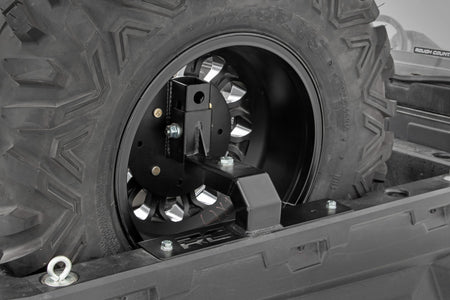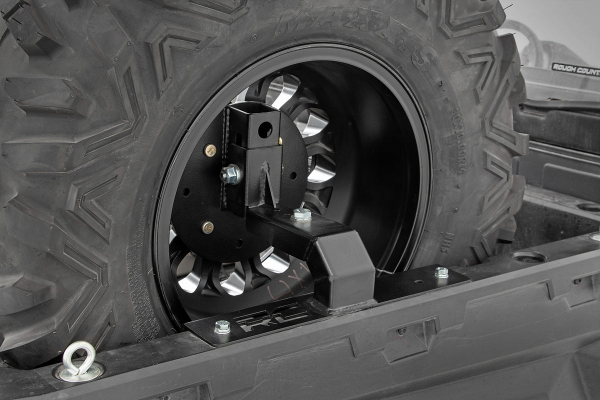 Have you personally struggled with sorting your cargo in your Ranger or Defender while being prepared for the trails? Carrying a full-size spare with you on your outings is a huge plus, but you can lose that much-needed cargo space when placing it in the bed. Here at Rough Country we keep the adventurist in mind and created Rough Country's Bed Side Mount Spare Tire Carrier for Polaris Ranger/Can-Am Defender models!\ This durable, steel in-bed tire carrier is designed to carry a full sire replacement tire, displayed prominently in the bed railing. The adjustable mount allows you to position the carrier to accommodate different tire widths and wheel offsets. Each mount is powder-coated black for a long lifespan of corrosion resistance and features rubber grommet retainers to keep your bed free from scrapes and scuffs.?á\ Give your Ranger/Can-Am Defender an aggressive look and practical access to a full-sized spare anytime you need it with Rough Country?ÇÖs Bed Side Mount Spare Tire Carrier! Includes a Lifetime Replacement Guarantee