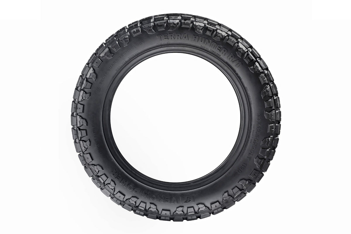 Give yourself peace of mind the next time you hit the road with Venom Power's line of R/T tires. Venom Power Terrain Hunter R/T is an all-season/all-terrain tire that not only functions well but looks good doing it! Each tire features a unique tread pattern that is sure to perform well in all weather conditions and ensures a secure performance on and off-road. Venom Power's Terrain Hunter R/T is a hybrid tire that gives you MT performance with the road noise level of an all-terrain tire making it the pinnacle for SUV's and light trucks.