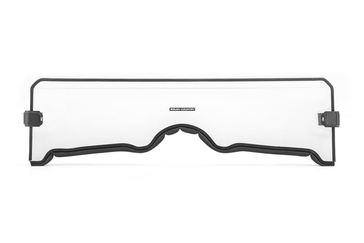 Added Protection and comfortability. Protect the occupants of your Yamaha Rhino from off-road hazards such as rocks, branches, and other debris with Rough Country's Scratch-Resistant Windshields. UTV Windshields offer a clear visual of the trail ahead and allow for a much more comfortable outing!\ High-Quality Polycarbonate Construction. Rough Country UTV windshields are constructed from thick polycarbonate material that is precision cut for a perfect fit. The polycarbonate material provides an ideal combination of clarity, flexibility, durability that outperforms glass, acrylic, and other windshield materials.\ Durable Scratch and UV Resistance. Each windshield is not only constructed from thick polycarbonate material but enhanced by a secondary AR2 hard-coating process. This process completely coats the windshield with a hardened, scratch-resistant barrier. This treatment also provides the additional benefit of UV protection.\ Easy Installation. With a simple strap-on installation process, installing a Rough Country windshield couldn't be easier. Within 15 ?Çô 30 mins you can be ready to hit the trails.\ Limited-Lifetime Replacement Warranty. Rough Country's Scratch-Resistant Windshields are backed with a limited lifetime replacement warranty towards manufacturer defects. As such, the product is protected from structural and workmanship damage after the date of purchase. With our industry-leading warranty give yourself peace of mind when using Rough Country's Suspension products!
