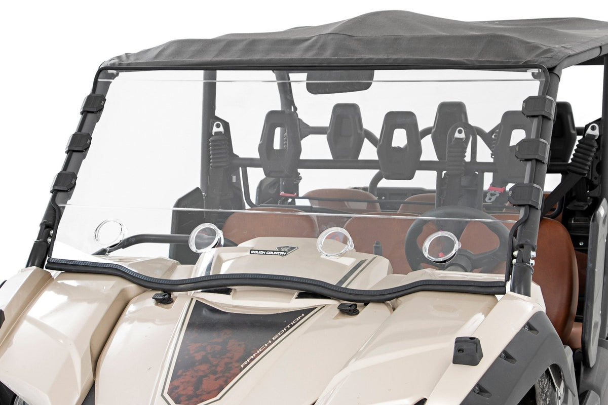 Added Protection and comfortability. Protect the occupants of your Yamaha Viking from off-road hazards such as rocks, branches, and other debris with Rough Country's Scratch-Resistant Windshields. UTV Windshields offer a clear visual of the trail ahead and allow for a much more comfortable outing!\ High-Quality Polycarbonate Construction. Rough Country UTV windshields are constructed from thick polycarbonate material that is precision cut for a perfect fit. The polycarbonate material provides an ideal combination of clarity, flexibility, durability that outperforms glass, acrylic, and other windshield materials.\ Durable Scratch and UV Resistance. Each windshield is not only constructed from thick polycarbonate material but enhanced by a secondary AR2 hard-coating process. This process completely coats the windshield with a hardened, scratch-resistant barrier. This treatment also provides the additional benefit of UV protection.\ Easy Installation. With a simple strap-on installation process, installing a Rough Country windshield couldn't be easier. Within 15 ?Çô 30 mins you can be ready to hit the trails.\ Limited-Lifetime Replacement Warranty. Rough Country's Scratch-Resistant Windshields are backed with a limited lifetime replacement warranty towards manufacturer defects. As such, the product is protected from structural and workmanship damage after the date of purchase. With our industry-leading warranty give yourself peace of mind when using Rough Country's Suspension products!